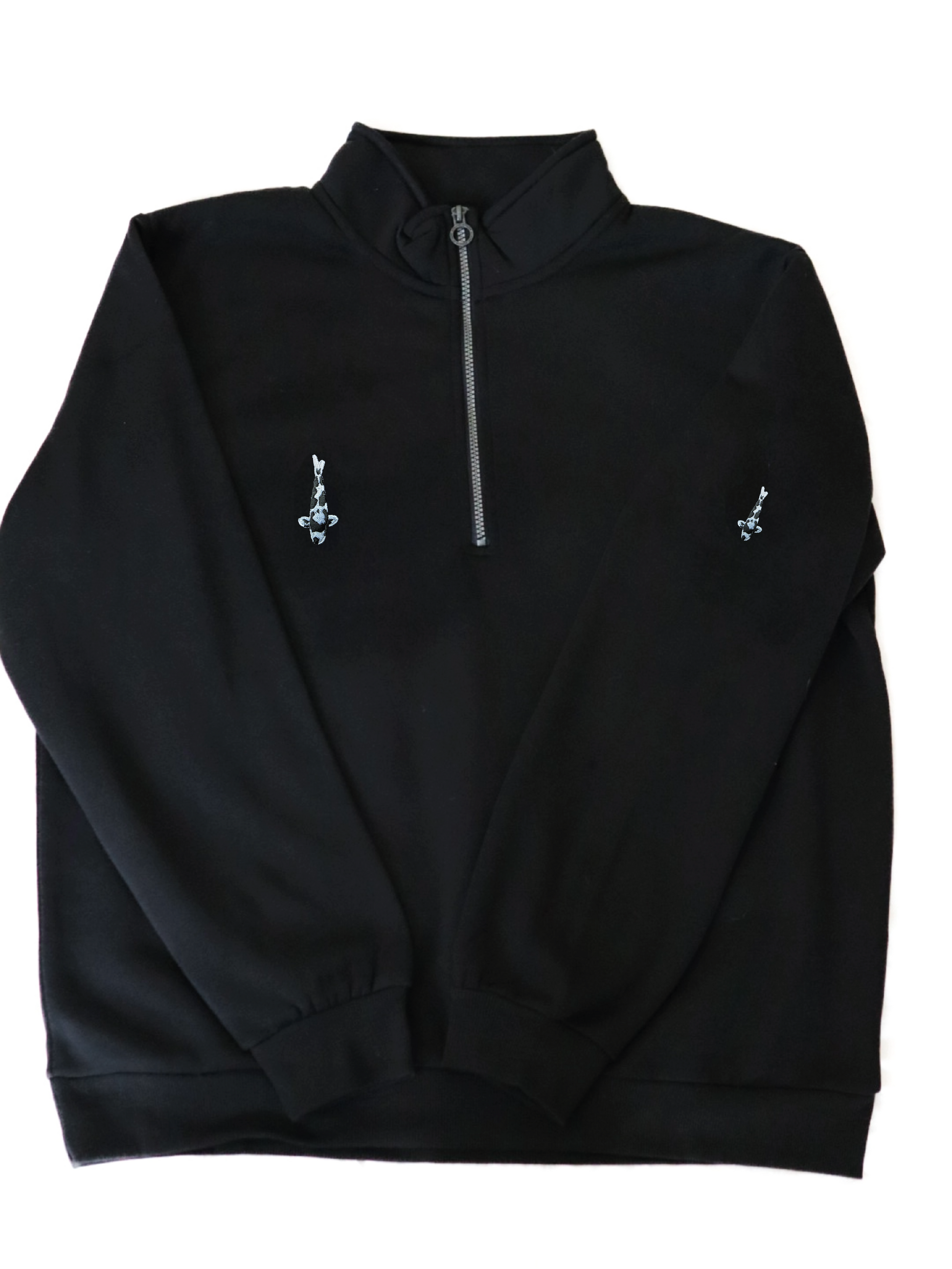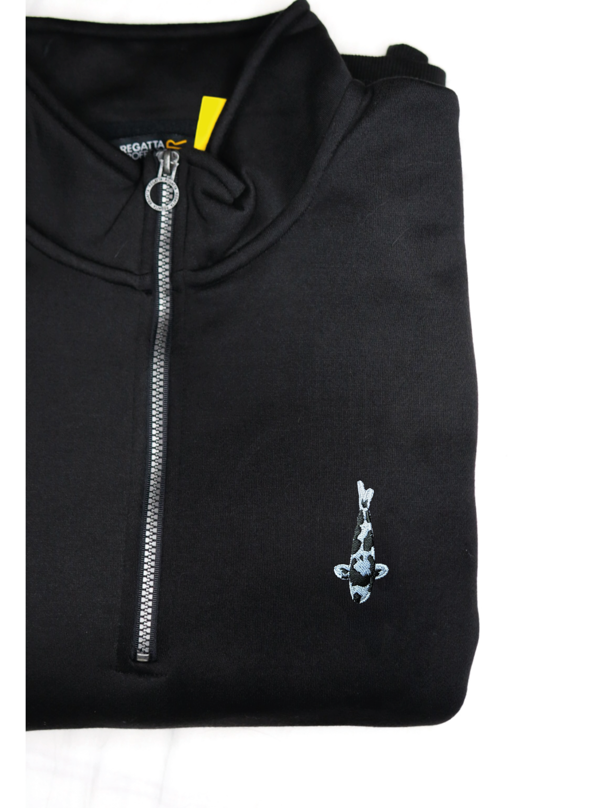 35% sustainable cotton and 65% polyester brushed back fabric. Ribbed cuffs and hem. Half-zip.