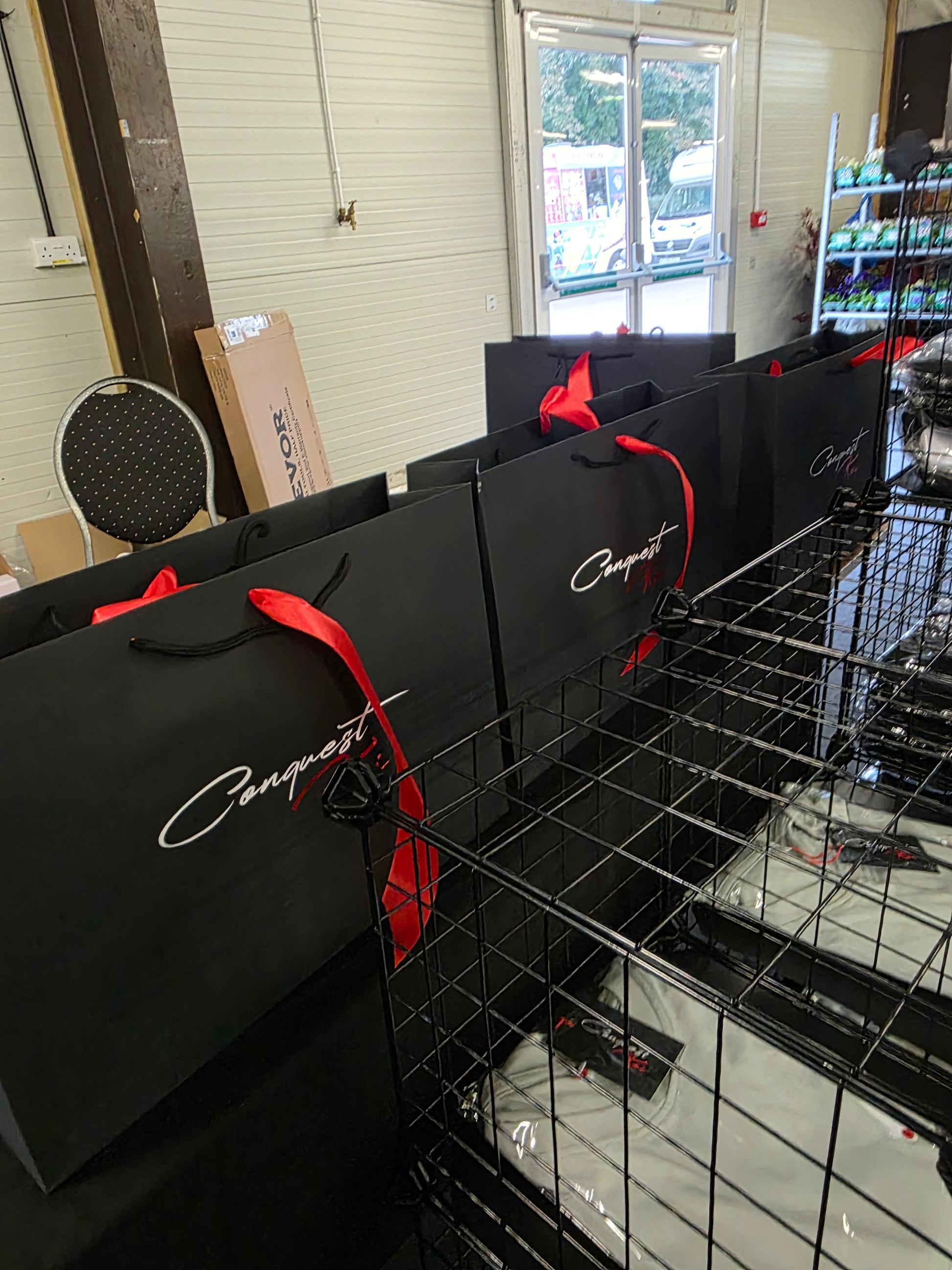 These paper bags look so simple and modern, featuring our Signature and Red Bow Ribbon.