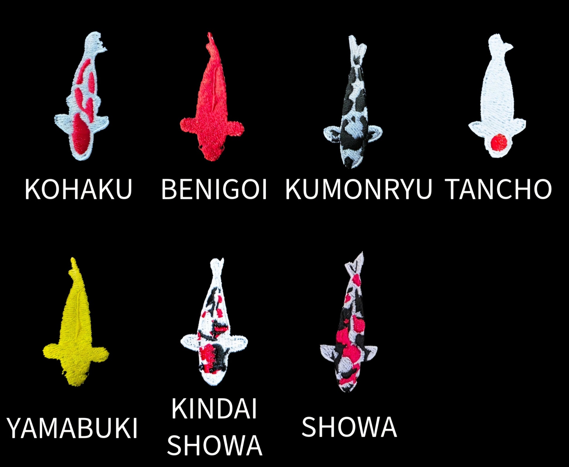 All work is inspired by real Koi fish, drawn and embroidered by me. Some even inspired by my own koi collection.