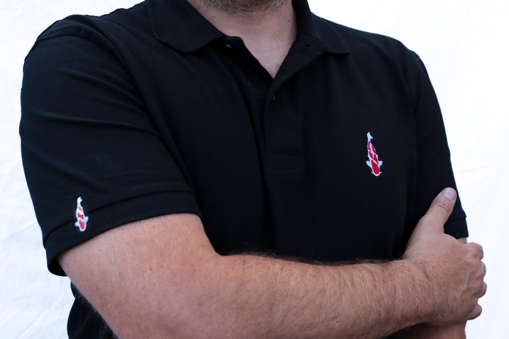 - Polo Includes Two pieces of Koi art, one on the sleeve and left breast.